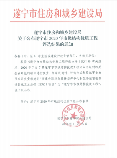 蜀鸿公司遂宁EPC项目荣获遂宁市“结构优质工程”